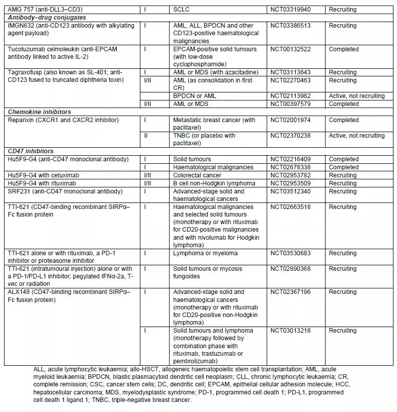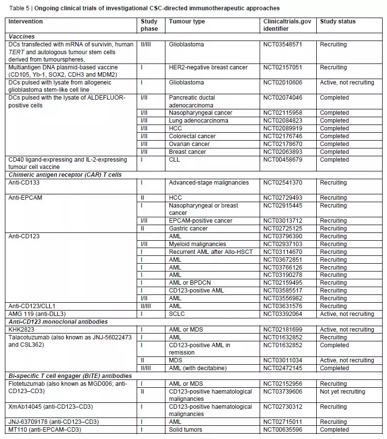 表5 靶向癌症干细胞的在研免疫疗法正在进行的临床试验