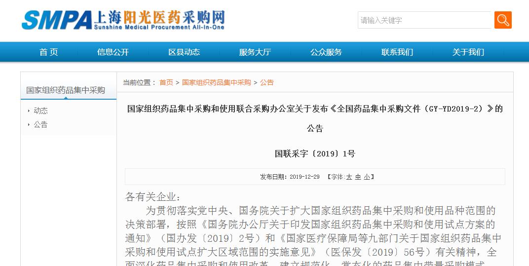 昨日(12月29日),上海市阳光医药采购网发布《国家组织药品集中采购和使用联合采购办公室关于《全国药品集中采购文件(GY-YD2019-2)》的公告》(以下简称公告),采购品种涉及阿比特龙口服常释剂型等33个品种,这业意味着第二批国家带量采购正式拉开序幕。