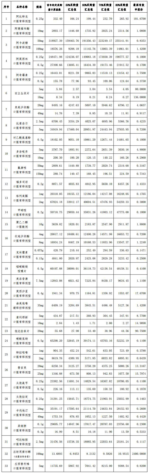 对于备受关注的约定采购量,文件明确,本次药品集中采购周期自中选结果实际执行日起,以年为单位。各地首年约定采购量计算基数由各地确定。各地各品种首年约定采购量按以下规则确定:全国实际中选企业为1家的,为首年约定采购量计算基数的50%;全国实际中选企业为2家的,为首年约定采购量计算基数的60%;全国实际中选企业为3家的,为首年约定采购量计算基数的70%;全国实际中选企业为4家及以上的,为首年约定采购量计算基数的80%。