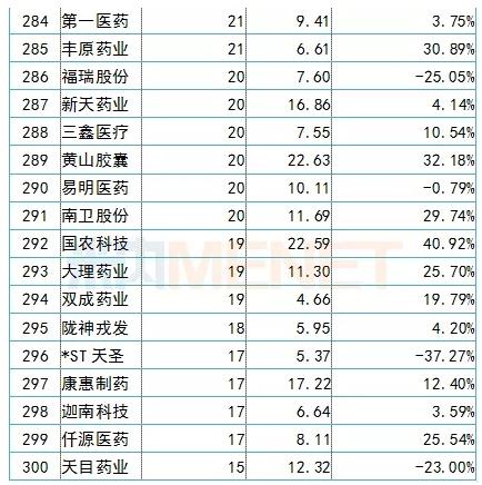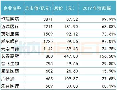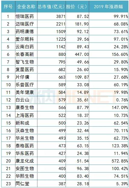 时光飞逝,一转眼2019年已经过去了。4+7集采、重点监控合理用药目录、医保目录调整等一系列政策在过去的一年中不断推动着行业的发展变革。截至2019年12月31日收盘,沪指突破前期高点,创8个月新高,医药板块掀涨停潮,鲁抗医药等逾10股封板,为2019年画上一个完美的句号。在300家A股药企中,恒瑞医药、迈瑞医疗、药明康德等5家市值超过千亿,从涨跌幅来看,有28家药企市值翻倍,其中,康龙化成涨幅最大,达572.85%;其次是兴齐眼药和济民制药,均超过300%。此外,还有微芯生物、博瑞医药等5家科创板药企也超过100%。