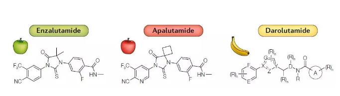 上图显示的是目前在国外已经上市的三个第二代雄激素受体阻断剂,从左到右分别是:恩杂鲁胺、阿帕鲁胺以及达洛鲁胺。由于恩杂鲁胺和阿帕鲁胺样子长得非常像,而达洛鲁胺是结构完全不一样但疗效却差不多的药物,欧美的专家把这三个药比作“2个苹果和1根香蕉”。2019年,国家药监局先后批准了“2个苹果”在国内上市,或许在未来的两三年里“1根香蕉”也会在国内上市。
