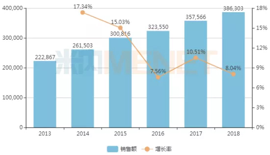 图3:2013-2018年中国公立医疗机构终端泌尿系统药物销售情况(单位:万元)