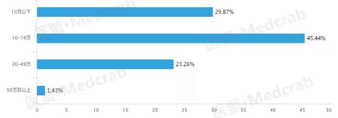 报告显示,有70.13%的医药代表年收入在10万以上,其中45.44%的代表集中在10-19万,23.26%在20-49万的区间内,有超过1.43%的代表年薪超过50万。