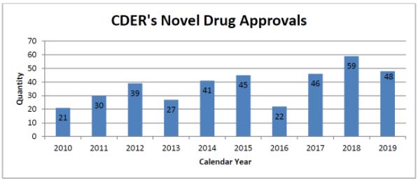 在2019年,CDER总计批准48款创新药(novel drugs),近20年来仅次于2018年的59款排在历史第二位。这些新药往往是解决未满足医疗需求或显著推进患者治疗的创新产品,它们的活性成分(active ingredients)以前从未在美国获得批准。