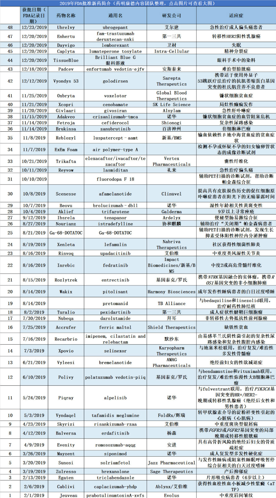 参考资料:[1] Advancing Health Through Innovation: New Drug Therapy Approvals 2019. Retrieved January 6, 2020, from https://www.fda.gov/media/133911/download