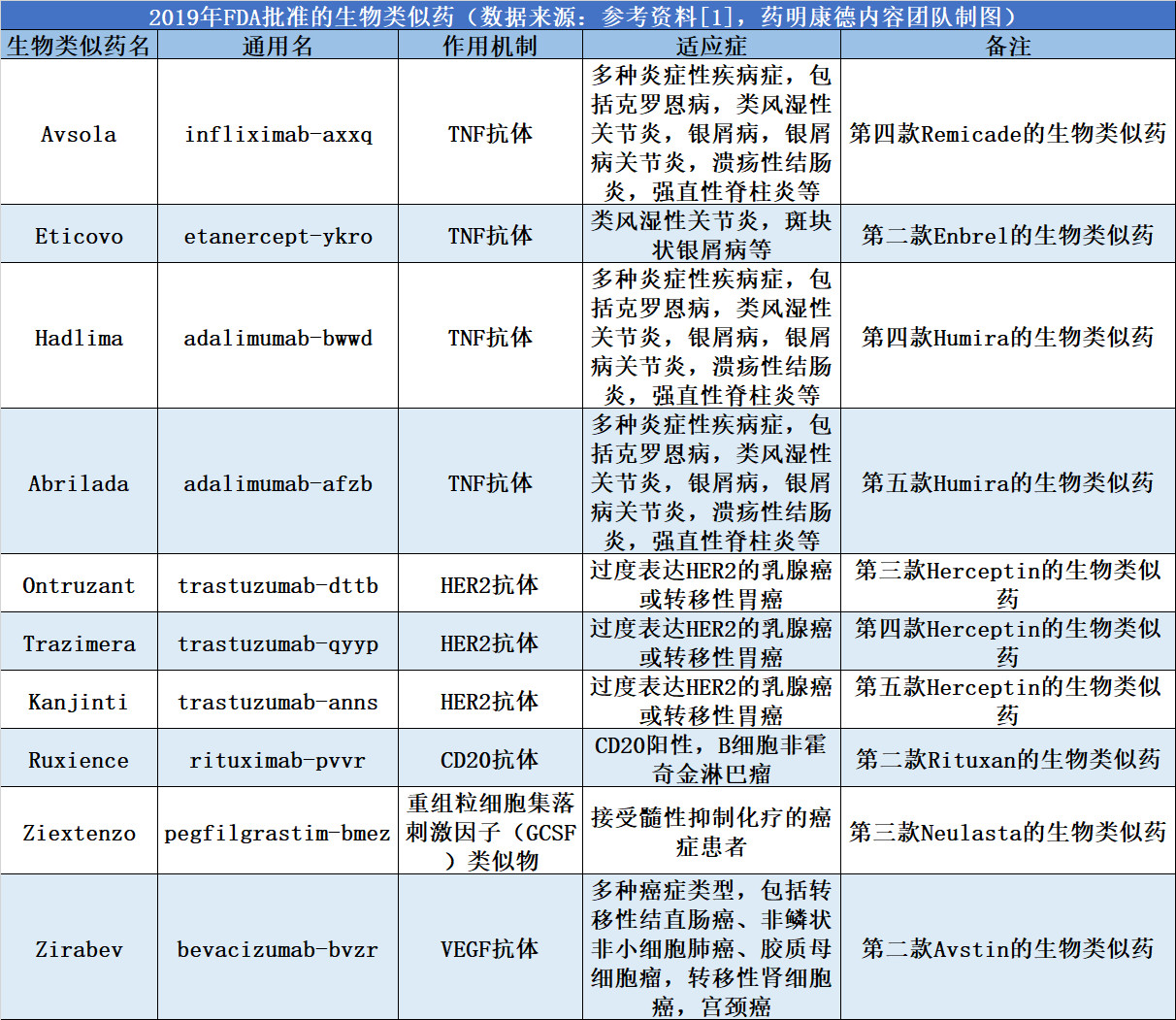 FDA批准的生物类似药(biosimilar)与FDA已经批准的创新生物制品相比非常类似,在安全性、纯度和效力方面没有临床意义上的差别。在2019年,FDA批准了10款新的生物类似药,它们的相关信息如下: