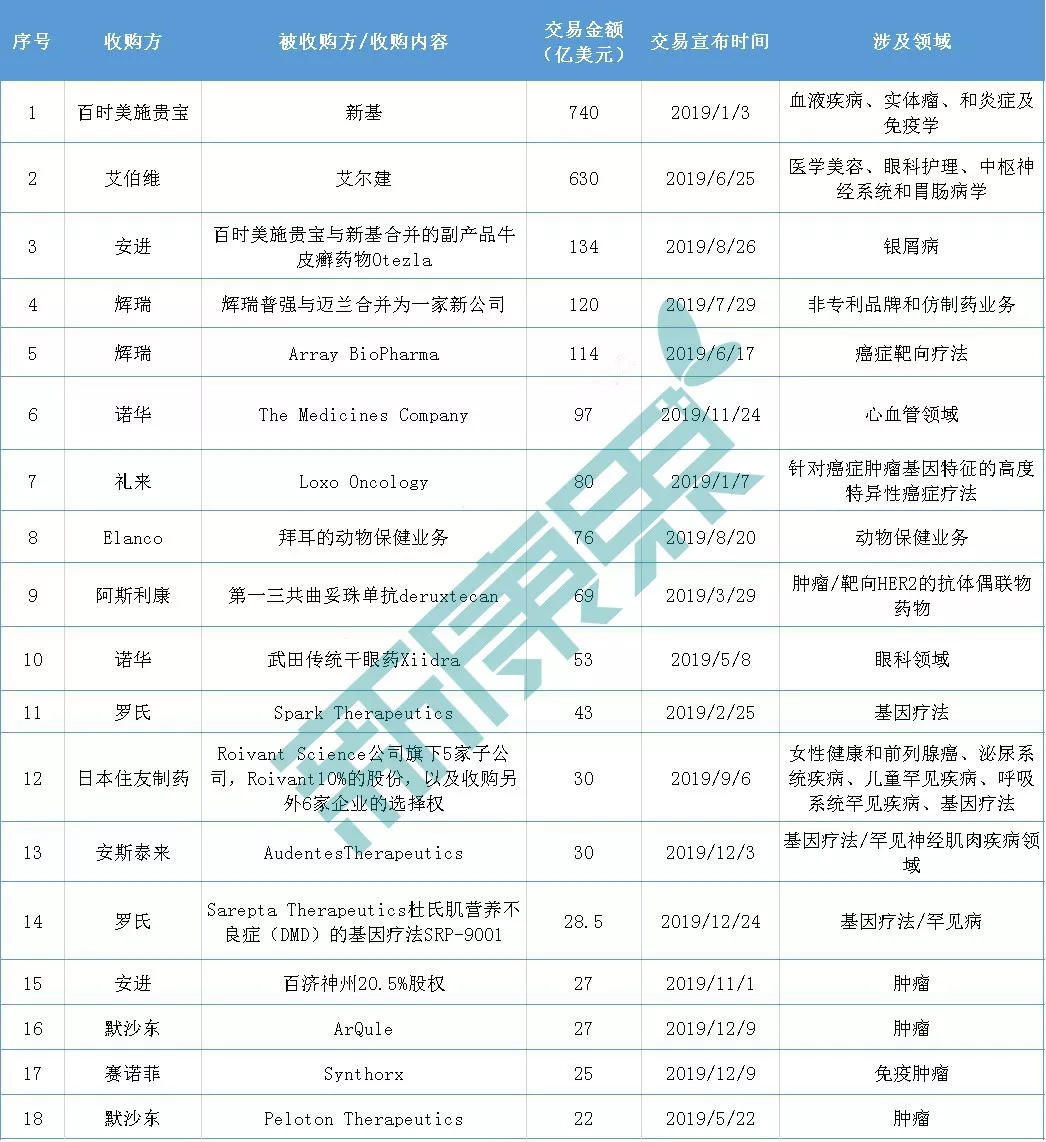 2019年是全球制药业并购蓬勃发展的一年。年初,制药界就传来重磅级收购消息,百时美施贵宝以740亿美元收购新基。而据路孚特的数据,若将债务包括在内,该笔交易价值达950亿美元,这将超过辉瑞在2000年以890亿美元收购华纳-兰伯特的交易记录,成为制药史上最大规模并购案!