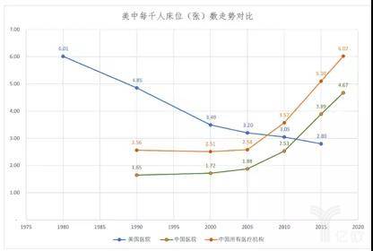 两相比较,目前中国人均医院病床数比美国高出67%,人均总病床数是美国的两倍。