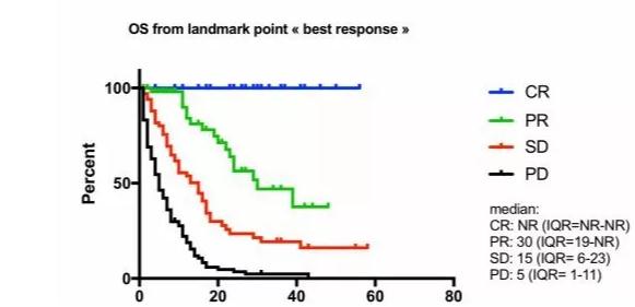 生存期方面:对76名起效的患者来说,中位无疾病进展生存时间为30个月,中位总生存时间尚未达到(估计超过53个月,这是好事,证明截止目前,起效的患者中,有超过一半以上的患者,依然健在)。当然,疗效越好的患者,生存期越长。截止目前,疗效达到肿瘤完全缓解的患者,几乎100%还健在。