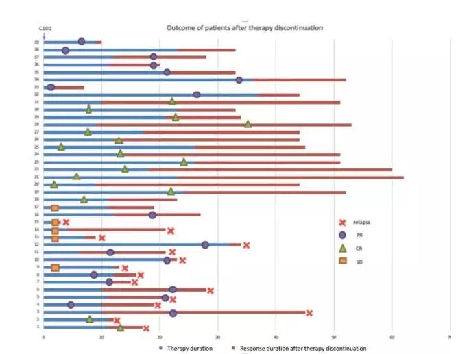 起效后,能否提前停药?有39名患者用药后肿瘤得到了控制,但由于各种各样的原因,未用满2年被迫提前停药。截止目前,有15名患者已经出现疾病复发进展,从停药到复发的中位时间是4个月,而另外24位患者疗效一直维持。