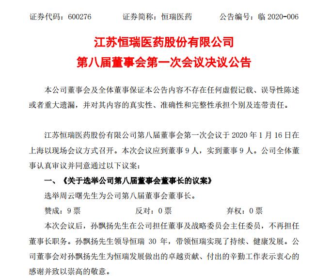 昨日晚间,恒瑞医药发布《恒瑞医药第八届董事会第一次会议决议公告》称,孙飘扬不再担任董事长一职,现任总经理周云曙将接替孙飘扬出任恒瑞医药董事长一职。