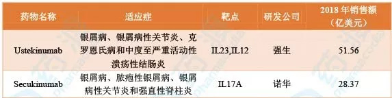 银屑病市场上,强生与诺华公司的交相呼应,重磅迭起。IL-12/23 Ustekinumab凭借先行的优势,目前在银屑病市场遥遥领先,2018年销售额为51亿美元。诺华公司的IL-17 Secukinumab依靠头对头研究,打败了Ustekinumab,市场上一路高歌猛进,大有赶超的趋势。