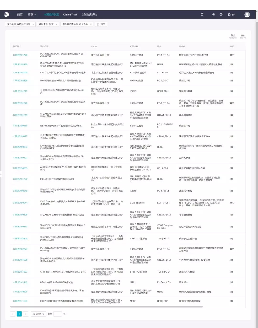 下图为国内企业在研的双抗临床进展,图片来源 Insight 数据库(https://db.dxy.cn/v5/clinical)
