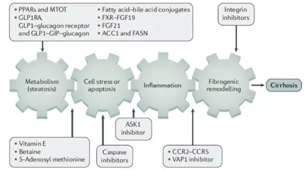 虽然目前尚不知道NASH的具体发病机制,但根据2019年4月发表在Nature上的一篇综述,目前认为NASH的疾病发展和进展模型是线性的,它的形成是因为过量的代谢底物被输送到肝脏,最终导致了细胞应激、凋亡、炎症和纤维化。此外,NASH的形成也和微生物群的变化有关。这些研究成果为科学家们开发NASH治疗药物奠定了夯实的基础。