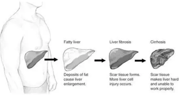 ▲从左到右:正常肝脏→脂肪肝(脂肪沉积导致肝脏肿大)→肝纤维化(肝脏瘢痕组织形成,肝细胞损伤增多)→肝硬化(肝脏变硬,功能受损)(图片来源:NIH)