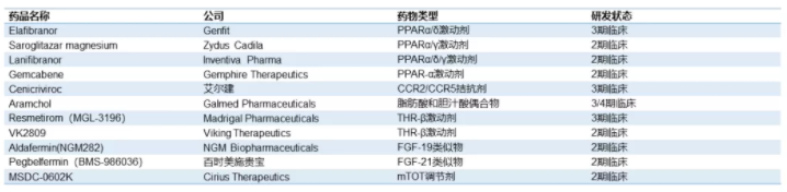 FXR激动剂之外,科学家们也在尝试开发针对其它靶点的药物,希望能找到对付NASH的最佳“武器”。目前已进入2/3期临床阶段的其它在研创新药物靶点主要包括PPAR、THR-β、CCR、FGF等几类,其中PPAR是企业关注比较多的一个靶点。
