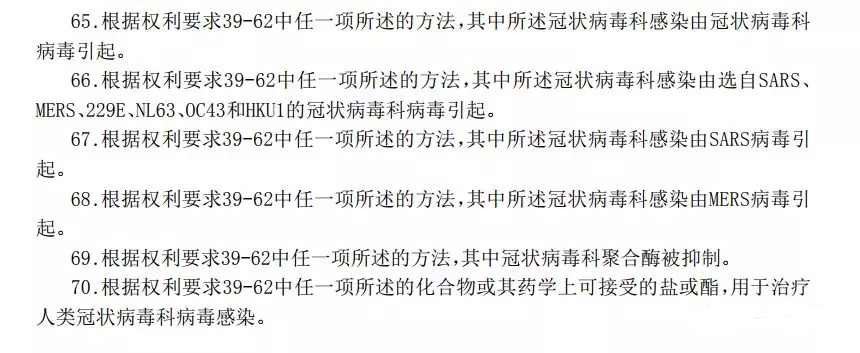 笔者认为,吉利德的专利申请号为CN2016800667968的发明专利申请已经公开了瑞德西韦用于治疗冠状病毒的用途,从这个专利申请的权利要求65-70可以看出,其概括了所有抗冠状病毒的用途,即公开了一个较宽的范围。而2019新冠病毒是吉利德专利申请CN2016800667968公开的较宽范围内的窄范围,属于《专利审查指南》规定的选择发明。