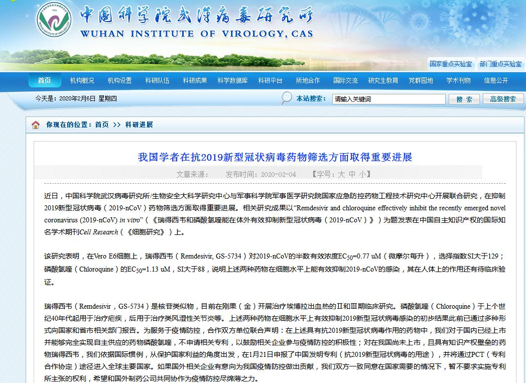 根据武汉病毒研究所2月4日发布的信息,武汉病毒研究所在1月21日申报了中国发明专利(抗2019新型冠状病毒的用途),并将通过PCT(专利合作协定)途径进入全球主要国家。