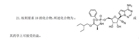吉利德公司针对瑞德西韦类似相关药物和针对病毒的治疗方法早就申请了PCT专利进行了全球专利布局,该PCT专利PCT/US2011/045102 于2011年7月22日申请,有57项同族专利申请,其中进入中国国家阶段的专利CN2011800357761“用于治疗副黏病毒科病毒感染的方法和化合物”于2015年11月25日授权,目前该专利处于有效维持状态。该专利的化合物结构使用马库什撰写方式,保护范围较宽,在治疗用途上也进行了比较上位的概括。权利要求21就是被保护的瑞德西韦的分子结构。该专利保护了化合物和治疗用途,属于基础专利和核心专利。