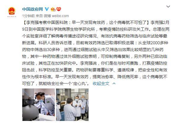 同日,李克强到中国医学科学院病原生物学研究所,考察疫情防控科研攻关工作。总理在两个实验室详细了解病毒传播途径研究情况、有效抗病毒药物筛选与临床试验等最新进展。科研人员告诉总理,目前有效药筛选已取得积极进展:从全球2000多种药物中筛选出30多种,进而通过细胞试验从中又筛选出效果比较明显的几种药物,其中一种药物通过体外细胞试验表明,可抑制病毒复制,另外两种已启动临床试验,其他正在加快研究中。李克强说,你们是在与时间赛跑,打赢疫情防控阻击战,科学防控至关重要。药物研制要尊重科学、遵循规律,把安全性和有效性作为根本标准。早一天发现有效药,提高治愈率、降低病死率,这个病毒就不可怕了,就能给全社会一个“定心丸”。