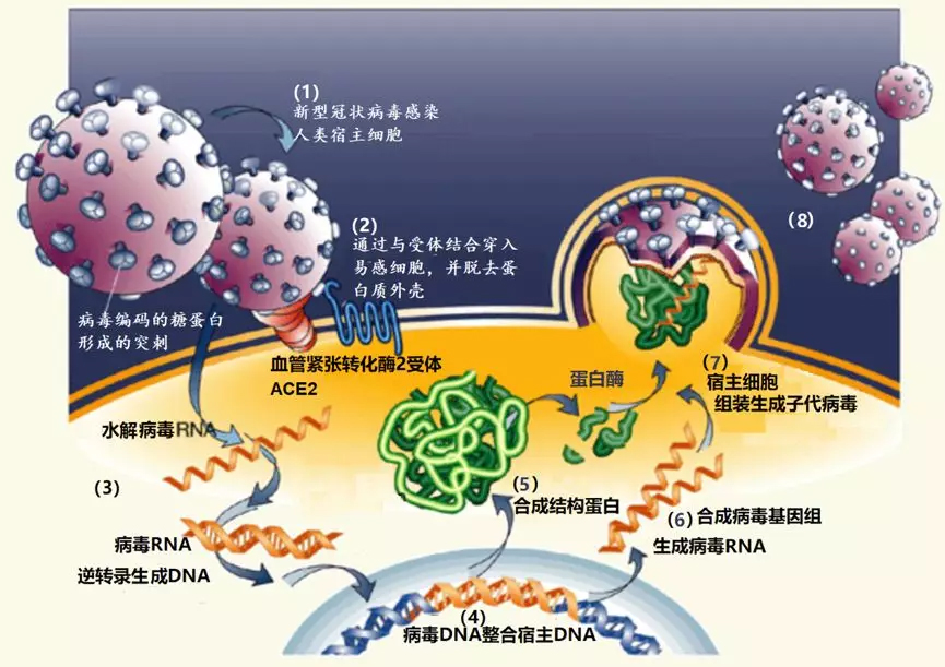 新型冠状病毒主要通过结合人类口腔、鼻腔中大量分布的粘膜细胞上血管紧张转化酶2 (ace2) 受体感染人类,具体的感染和复制过程示意图如下:
