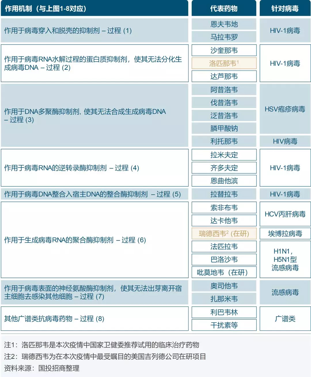 抗病毒药物主要针对病毒感染的机制和途径来设计开发,包括干扰病毒吸附、阻止病毒穿入细胞、抑制病毒生物合成、抑制病毒释放或增强宿主抗病毒能力等。根据上图的不同作用机制,目前主要的抗病毒药物分为以下几类: