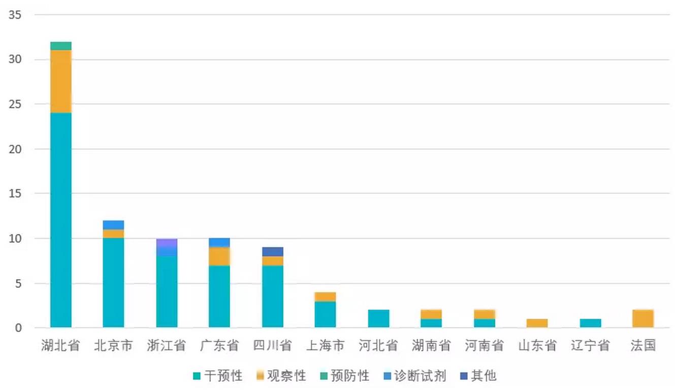 从研究类型来看,药物干预性治疗占 90%,其次是观察性研究,观察性研究主要以疾病特征、药物对疾病预防或预后影响,还有疫情与相关的其他基础疾病的临床研究,法国还开展了两项关于中高危新冠状病毒感染风险人群和感染临床特征的观察性研究。