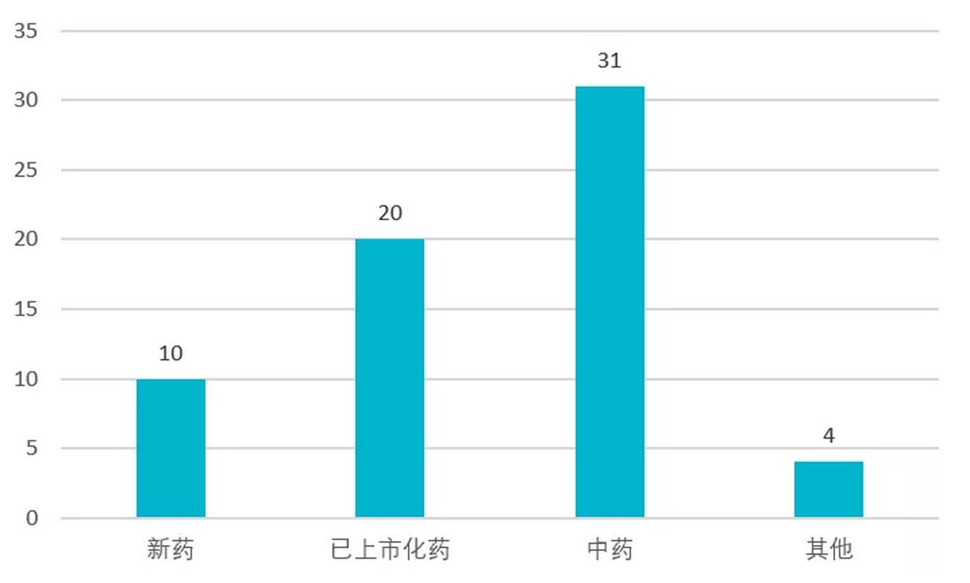 在药物干预性治疗试验中,从药物类型以中药相关治疗为主,包括中成药、中西医结合的治疗方案和中药注射液等;已上市化药中主要是以小分子抗病毒药物为主,还有干扰素,治疗疟疾的氯喹类药物,调节免疫的免疫球蛋白和免疫抑制作用的激素。抗 HIV 组合疗法蛋白酶抑制剂洛匹那韦/利托那韦出现在 9 项研究中,氯醛类药物出现在 8 项研究中。