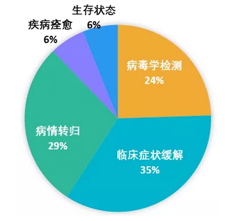 在药物干预性治疗试验中,根据部分已公布临床试验终点设计的方案,主要终点以临床症状缓解和病情转归为主,部分试验以病毒学检测结果新冠状病毒核酸转阴为主要终点。