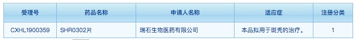 2019年11月12日,瑞石生物医药有限公司向国家药监局递交的临床试验申请获受理。SHR0302 是一种小分子JAK1激酶选择性抑制剂,拟适用于斑秃的治疗。