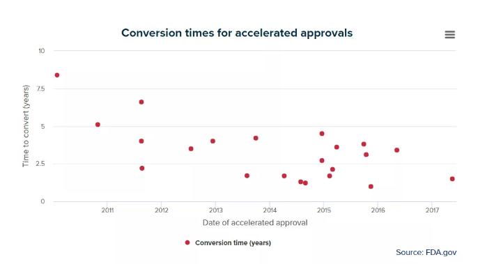 对于将加速批准转换为完全批准的时间,EvaluatePharma也做了统计。如下图最上角的是GSK的乳腺癌药物Tykerb,GSK花了8年多时间才将该药在2010年获得的加速批准新适应症转换为完全批准。