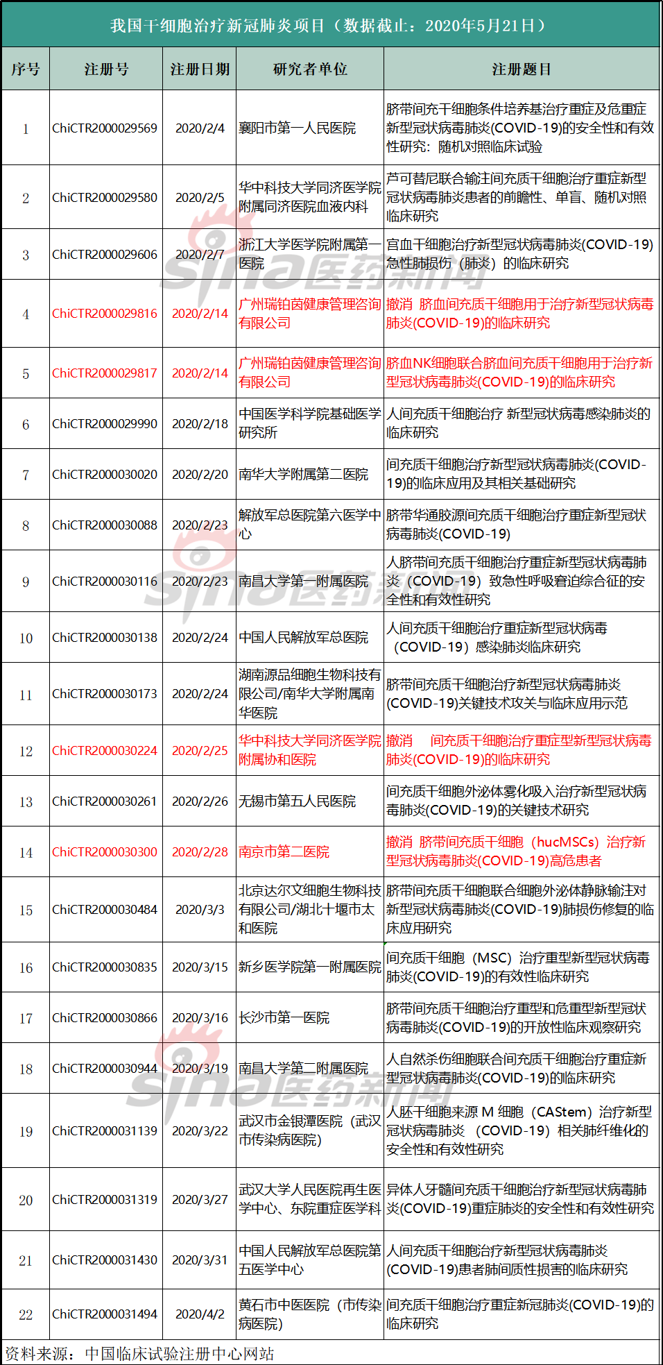 据中国临床试验注册中心的数据显示,截至5月21日,相关已注册的研究课题达到了22个(包括3个已撤销),其中自4月2日起,就没有新课题增加。