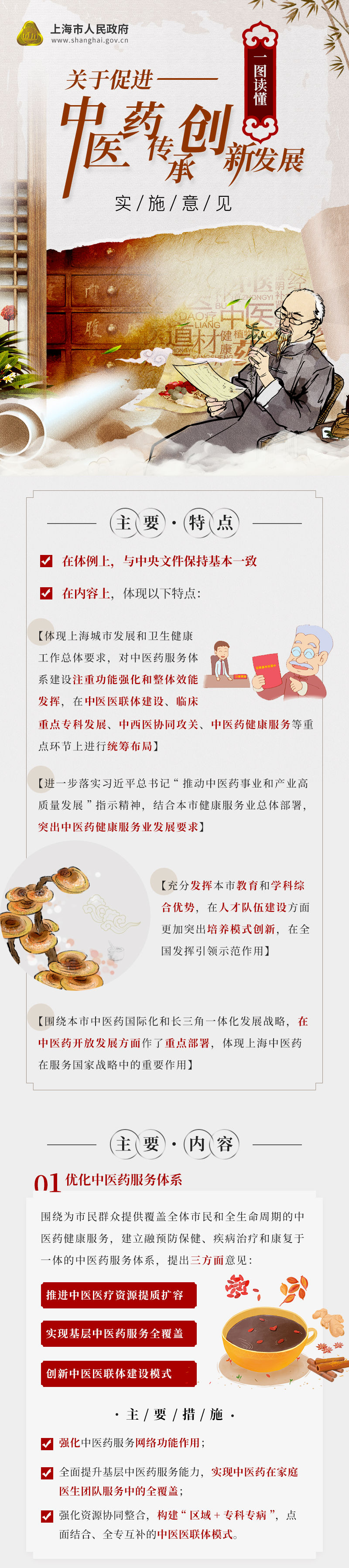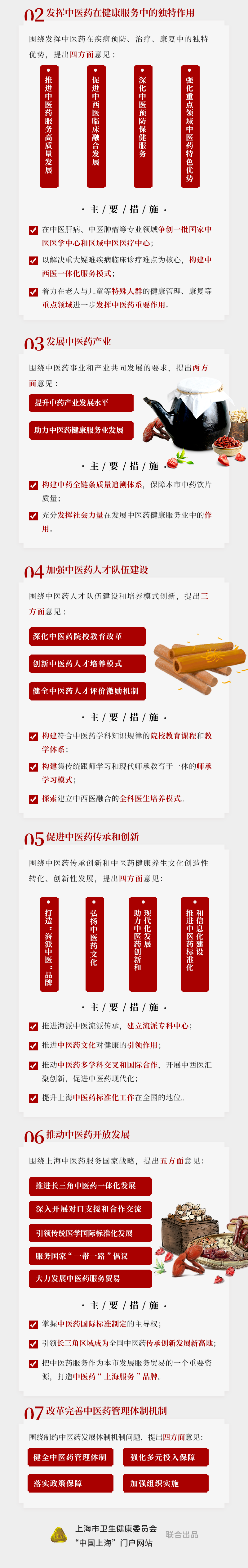 5月25日,为促进中医药传承创新发展,推动中医药和西医药相互补充、协调发展,上海市委、市政府联合印发《关于促进中医药传承创新发展的实施意见》,提出优化中医药服务体系、发挥中医药在健康服务中的独特作用、发展中医药产业等7个方面25条意见。上海将实现中医药在家庭医生团队服务中的全覆盖,并在中医肝病、中医肿瘤、中医外科、中医针灸推拿和康复等专业领域争创一批国家中医医学中心和区域中医医疗中心。来看图解↓