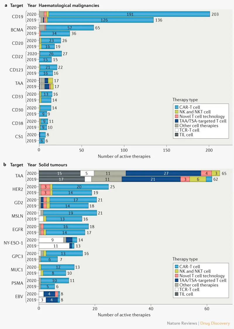 美国临床肿瘤学会(ASCO)年会即将在周末开幕,而作为癌症治疗的重大突破之一,癌症细胞疗法的最新进展也将在ASCO年会上亮相。日前ASCO年会摘要公布时,Allogene公司的“即用型”同种异体CAR-T疗法的初步临床结果,以及南京传奇和杨森公司合作开发的靶向BCMA的CAR-T的临床结果就受到广泛关注。同种异体的癌症细胞疗法到底有多火?细胞疗法在靶向实体瘤方面的进展如何?日前,纽约癌症研究所(Cancer Research Institute)的研究人员在Nature Reviews Drug Discovery上发表了一篇深度综述,对癌症细胞疗法这一突破性领域做出了详尽的分析。并且将这一领域的研发进展与上一年进行了比较。今天药明康德内容团队将介绍其中的精彩内容。