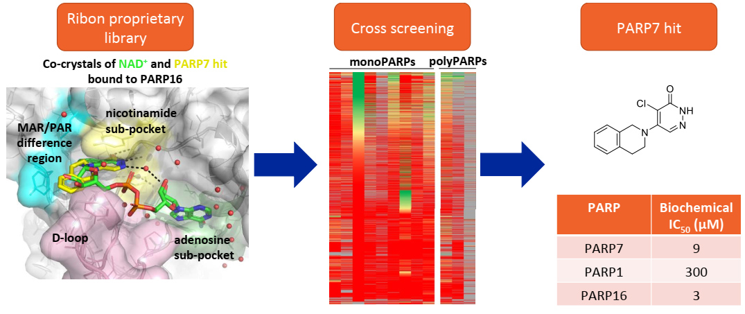 Ribon Therapeutics在今年召开的网络虚拟AACR会上发布了相关PARP7和PARP14抑制剂的最新动态,特别是PARP7抑制剂,作为首个新晋PARP抑制剂类药物,已经在开展临床I期试验(NCT04053673)。Ribon首先也是通过HTS发现苗头化合物,针对烟酰胺腺嘌呤二核苷酸(NAD+)结合口袋关键区域的靶标相互作用进行了先导化合物的优化。