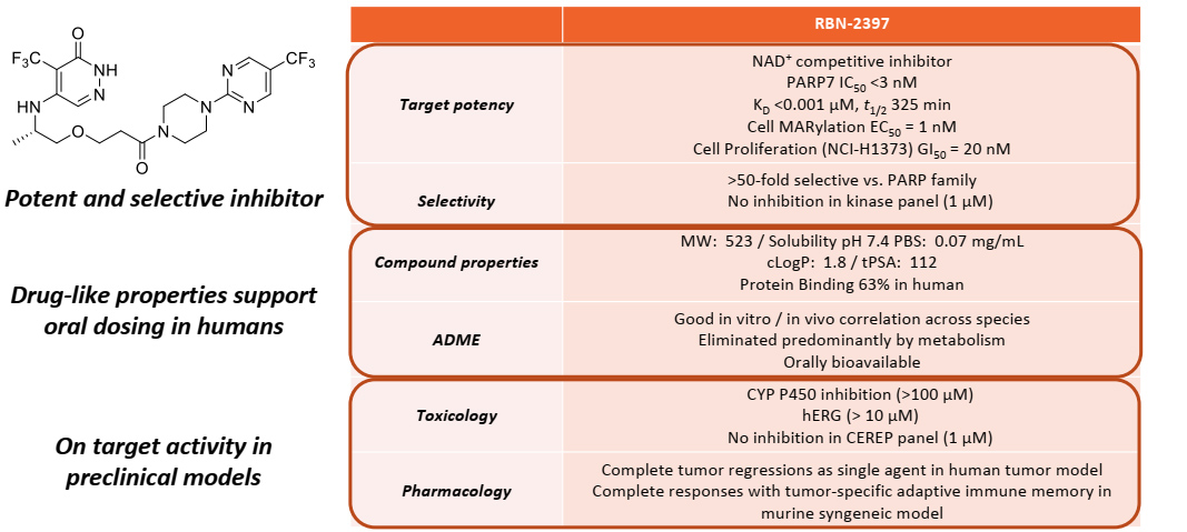 在腺苷口袋,利用与PARP7 Gly541的正相互作用,区别与其他PARP中的庞大残基的不利作用优化了选择性;同时去除芳环,以改善溶解度和微粒体稳定性,最终发现临床候选化合物RBN-2397。RBN-2397的临床前研究显示其达到了高活性和高选择性。RBN-2397对PARP7的IC50小于3nM,较其他家族成员的选择性大于50倍以上。