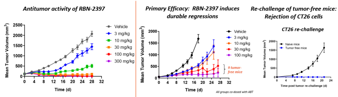 PARP7抑制作用“释放”了胞质核酸,重新激活有效的核酸传感并阻止肿瘤细胞增殖和诱导肿瘤消退。临床前研究测试了多个瘤种的125种衍生细胞系,在NCI-H1373 (人肺癌腺癌细胞)细胞的异种模型中,PARP7抑制剂RBN-2397每天口服一次在≥30mg/kg的剂量下,显示出强大的抗肿瘤增长作用,并且呈剂量依赖性增长;重要的是,在实现无肿瘤的小鼠中,再次给与感染,能够对CT26细胞持续抑制,证明PARP7抑制剂RBN-2397诱导了肿瘤特异性适应性免疫记忆。