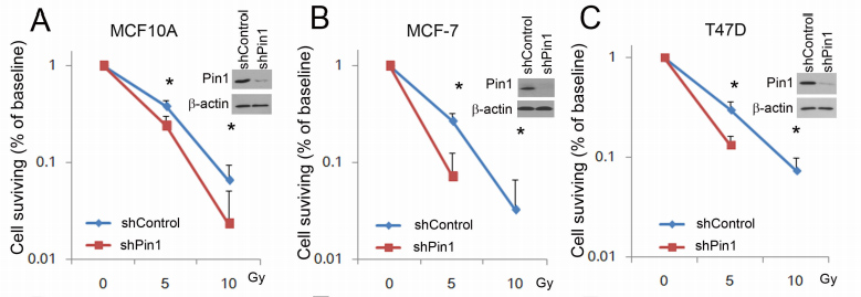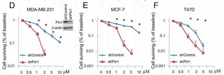 研究者们认为,Pin1稳定BRCA1并促进其在DNA损伤修复灶中的功能增加了Pin1敲除可破坏BRCA1稳定性的可能。接下来的研究显示,通过shRNA抑制Pin1会降低电离辐射后的细胞存活率(下图A-C),在MCF10A细胞(BRCA1和P53成熟型)中,Pin1抑制使5Gy IR下的集落形成减少了35%(图A),而在MCF-7(BRCA1和P53成熟型)乳腺癌细胞中,Pin1缺失使集落形成减少了约55%(图B),在T47D细胞(BRCA1+/P53-)中,Pin1缺失后辐射形成的集落减少了约74%(图C)。另一方面,在SUM149细胞中,BRCA1突变体(2288delT)Pin1敲低并没有进一步降低集落形成效率,表明Pin1的缺失对于BRCA1突变型未起到增效作用。