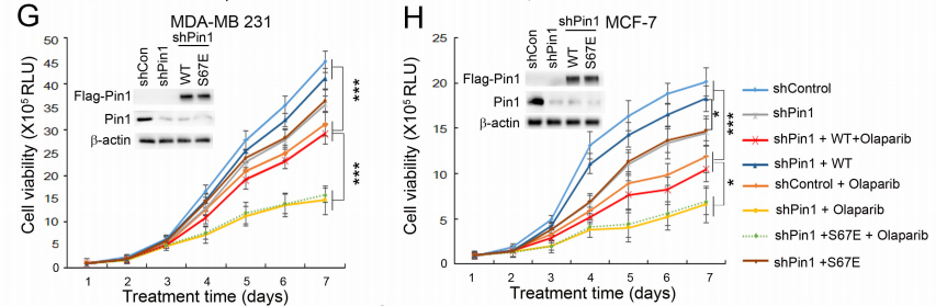 同样,细胞活力分析表明,通过Pin1敲低或奥拉帕利单药治疗可适度延迟MDA-MB 231和MCF-7细胞的生长,而在Pin1敲低的细胞中用奥拉帕利治疗导致细胞增殖几乎完全被阻滞(图G,H)。此外,当在shPin1 MDA-MB 231和MCF-7细胞中添加外源Pin1时,只有野生型,而不是无催化活性的Pin1突变体(S67E),能够挽救Pin1 RNAi与奥拉帕利的协同抑制作用(图 G和H)。