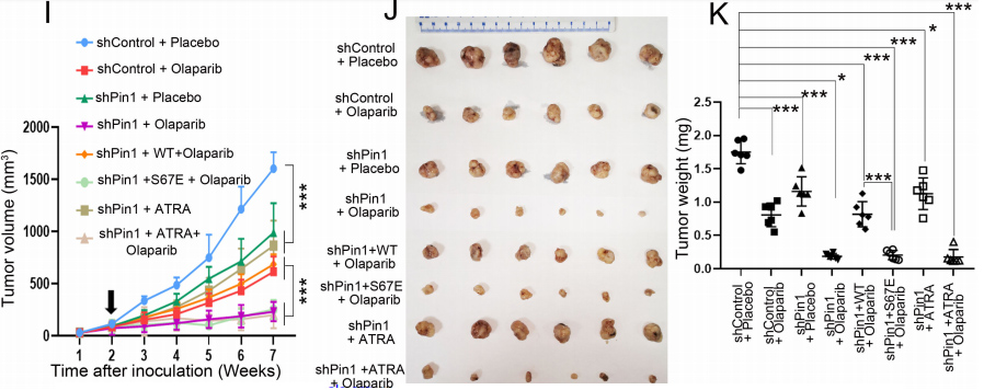 为了验证这一假设,研究人员用单一药物ATRA、奥拉帕利或它们的组合治疗了携带MDAMB 231异种移植物的小鼠5周,发现ATRA和奥拉帕利的组合显著延迟了肿瘤的生长。通过ATRA抑制Pin1在使BRCA1-WT异种移植物对奥拉帕利治疗敏感方面显示出与shRNA Pin1类似的作用;当ATAR与sh Pin1和奥拉帕利联合使用时,对肿瘤的抑制作用与sh Pin1和奥拉帕利联合使用一样强。这些结果加强了ATRA的作用是通过Pin1介导的。