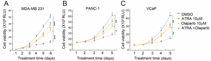据报道,所有的反式维甲酸(ATRA)都是Pin1抑制剂,导致Pin1降解,因此研究人员期望用ATRA进行治疗可产生与遗传Pin1缺失相似的效果。结果显示,无论是ATRA还是奥拉帕利,都可以延迟细胞生长,而ATRA和奥拉帕利的组合可以协同抑制细胞生长,这种效果不仅出现在MDA-MB 231和MCF-7细胞中,而且在BRCA1/2-WT胰腺癌细胞PANC-1和前列腺癌细胞VCaP中也是如此。这些体外数据表明,ATRA通过Pin1降解充当HR破坏剂,因此可能使BRCA1-WT肿瘤在体内对PARP抑制敏感。