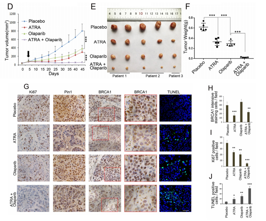研究在不包含BRCA1/2突变或HR DNA修复途径中核心基因改变的三阴性乳腺癌PDX中进一步测试了ATRA与奥拉帕利组合的治疗效果。结果显示,ATRA和奥拉帕利的组合显著阻止了肿瘤的生长(下图D-F),而单药治疗只能减缓这些肿瘤的生长。正如预期,ATRA导致Pin1和BRCA1的水平降低(下图G,H),ATRA和奥拉帕利的组合有效降低了肿瘤生长的增殖速率,并提高了凋亡率(图G,I,J)。另一方面,每组小鼠的体重没有显著差异,表明该组合没有明显的全身毒性。