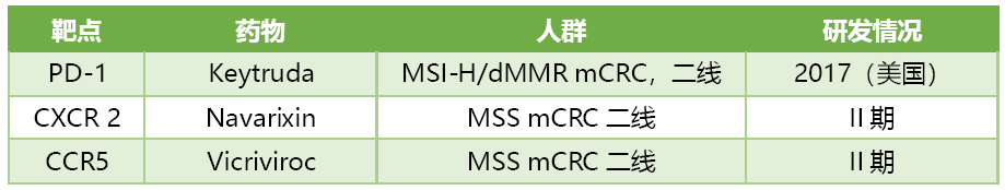 对于人群更大的MSS型mCRC患者,根据目前公布数据看免疫单药治疗不佳。抗PD-L1单抗+MEK抑制剂不优于瑞戈非尼,BMS和默沙东也都在布局这一人群。BMS的nivolumab与瑞戈非尼联用的Ib期REGONIVO的试验在今年公布结果,24例MSS型CRC患者中ORR为33%。默沙东另外两个处于II期的细胞趋化因子抑制剂都在进行与Pembro联用治疗MSS型mCRC患者的试验。