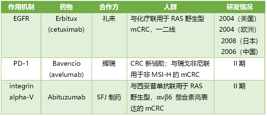 通过与礼来合作开发西妥昔单抗而进入mCRC领域,由于其PD-1抑制剂avelumab属于后进者,找到在CRC竞争较小的细分市场是关键,目前主要是探索单药早期CRC新辅助疗法,与瑞戈非尼联用治疗非MSI-H的mCRC人群。在2018年与SFJ制药合作开发abituzumab正在开展联合cetuximab用于在高表达ανβ6的RAS野生型左侧mCRC的一线治疗,之前研发报道左侧mCRC的RAS野生型比例更高。