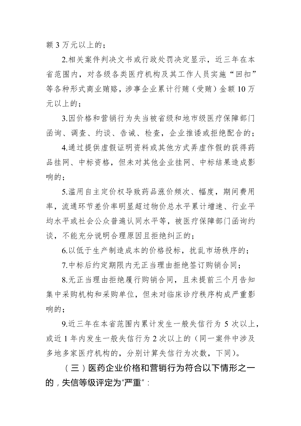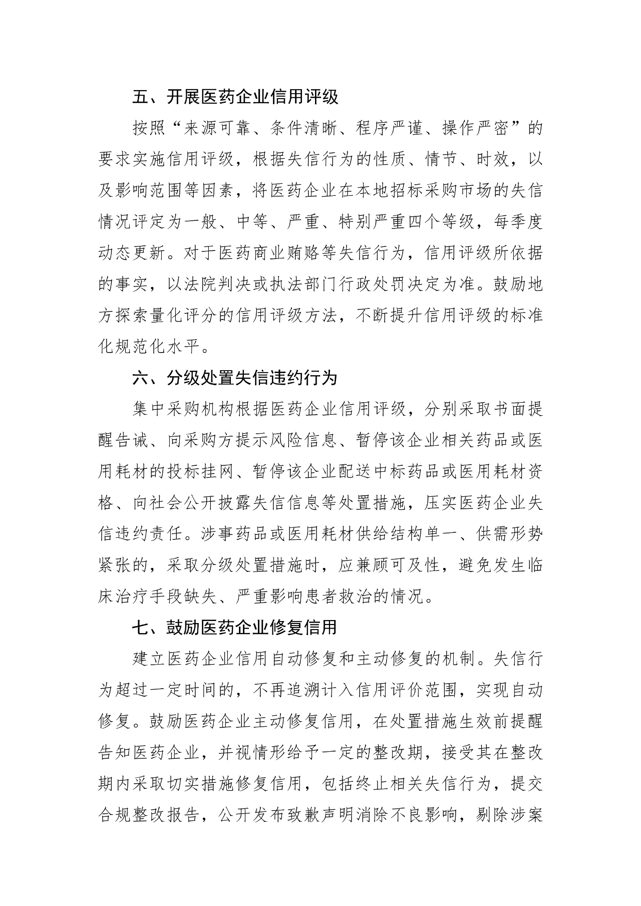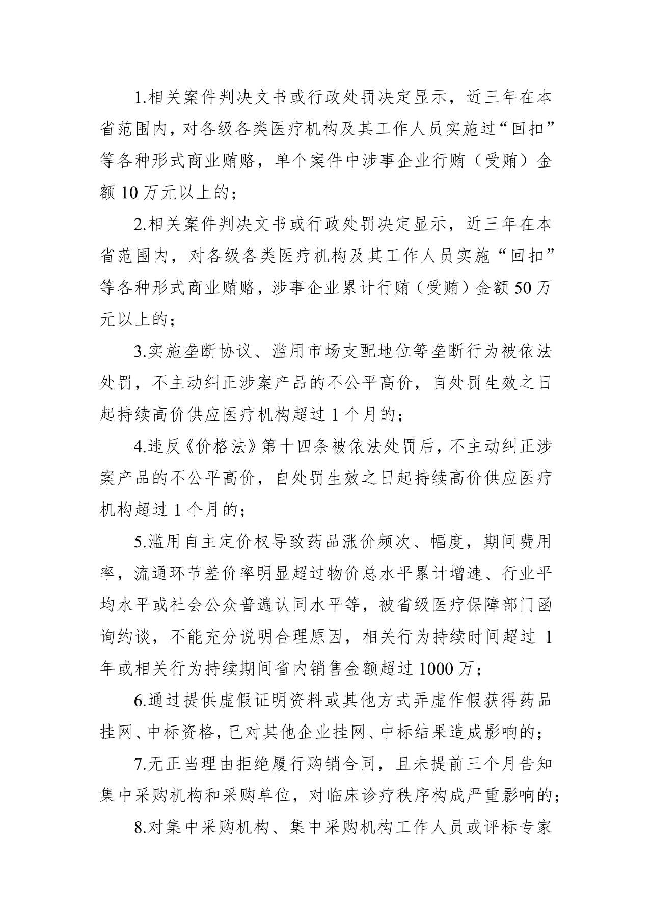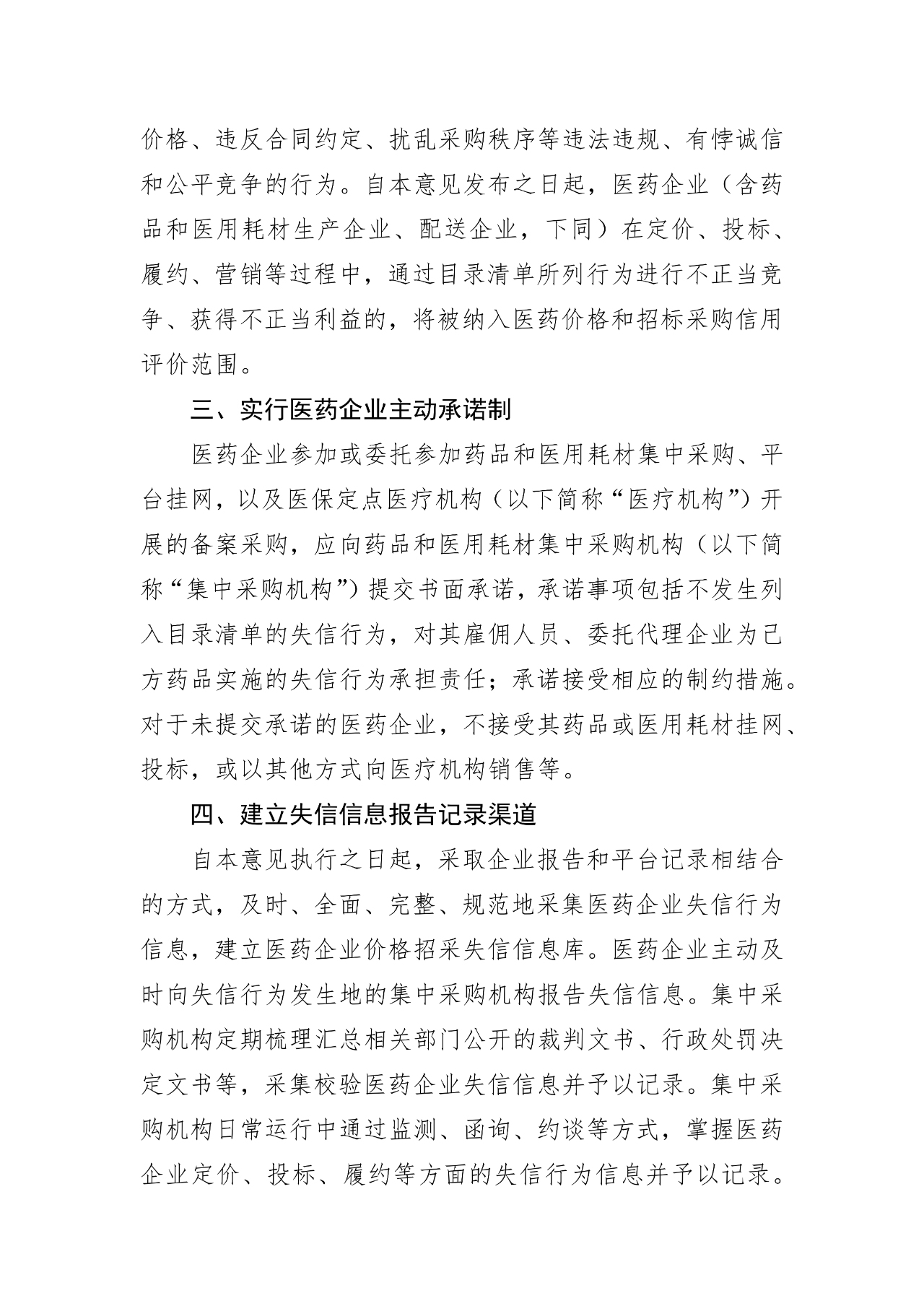 《指导意见》提出,建立医药价格和招采失信事项目录清单,具体内容包括包括但不限于医药商业贿赂、滥用市场支配地位、操纵市场价格、违反合同约定、扰乱采购秩序等违法违规、有悖诚信和公平竞争的行为。自意见发布之日起,医药企业(含药品和医用耗材生产企业、配送企业,下同)在定价、投标、履约、营销等过程中,通过目录清单所列行为进行不正当竞争、获得不正当利益的,将被纳入医药价格和招标采购信用评价范围。