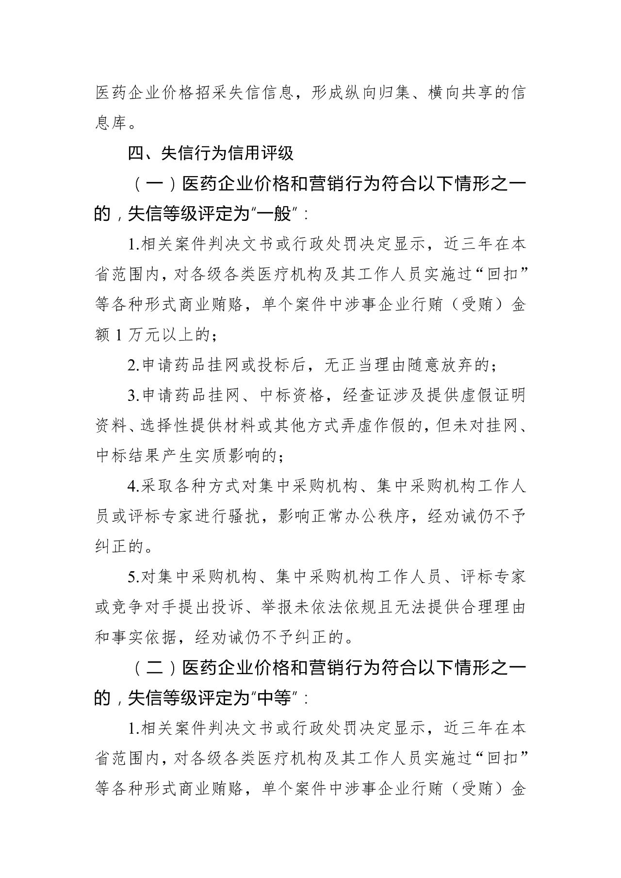 按照“来源可靠、条件清晰、程序严谨、操作严密”的要求,对医药企业实施信用评级,根据失信行为的性质、情节、时效,以及影响范围等因素,将医药企业在本地招标采购市场的失信情况评定为一般、中等、严重、特别严重四个等级,每季度动态更新。对于医药商业贿赂等失信行为,信用评级所依据的事实,以法院判决或执法部门行政处罚决定为准。鼓励地方探索量化评分的信用评级方法,不断提升信用评级的标准化规范化水平。