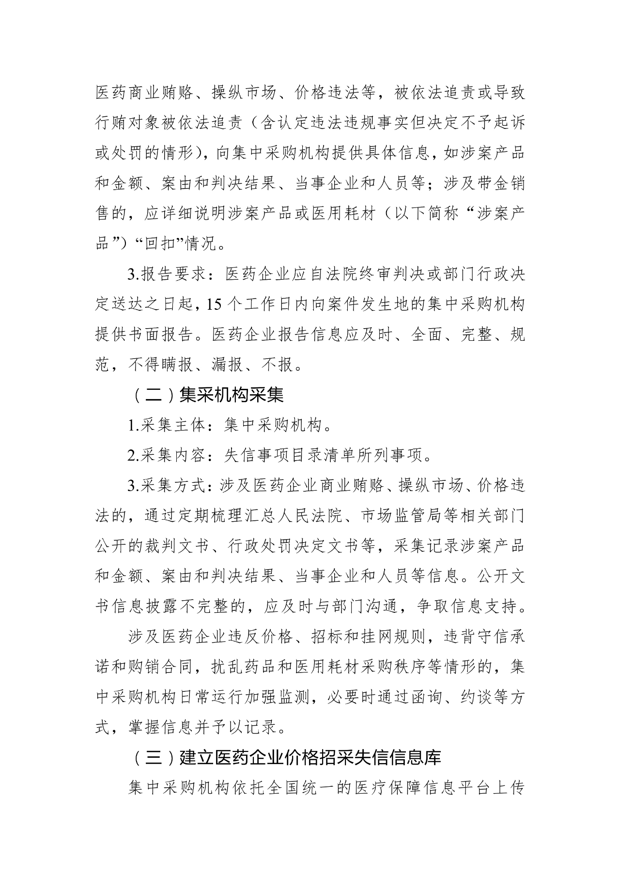 自本意见执行之日起,将采取企业报告和平台记录相结合的方式,及时、全面、完整、规范地采集医药企业失信行为信息,建立医药企业价格招采失信信息库。医药企业主动及时向失信行为发生地的集中采购机构报告失信信息。集中采购机构定期梳理汇总相关部门公开的裁判文书、行政处罚决定文书等,采集校验医药企业失信信息并予以记录。集中采购机构日常运行中通过监测、函询、约谈等方式,掌握医药企业定价、投标、履约等方面的失信行为信息并予以记录。