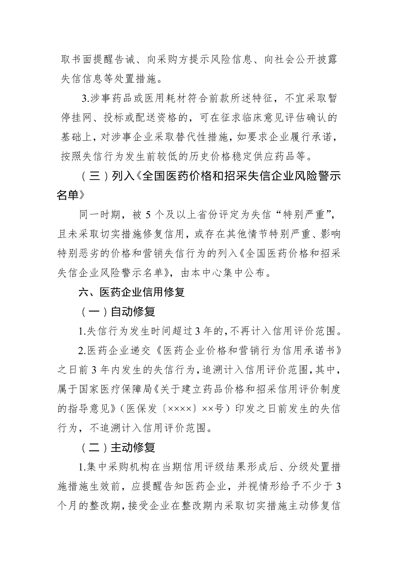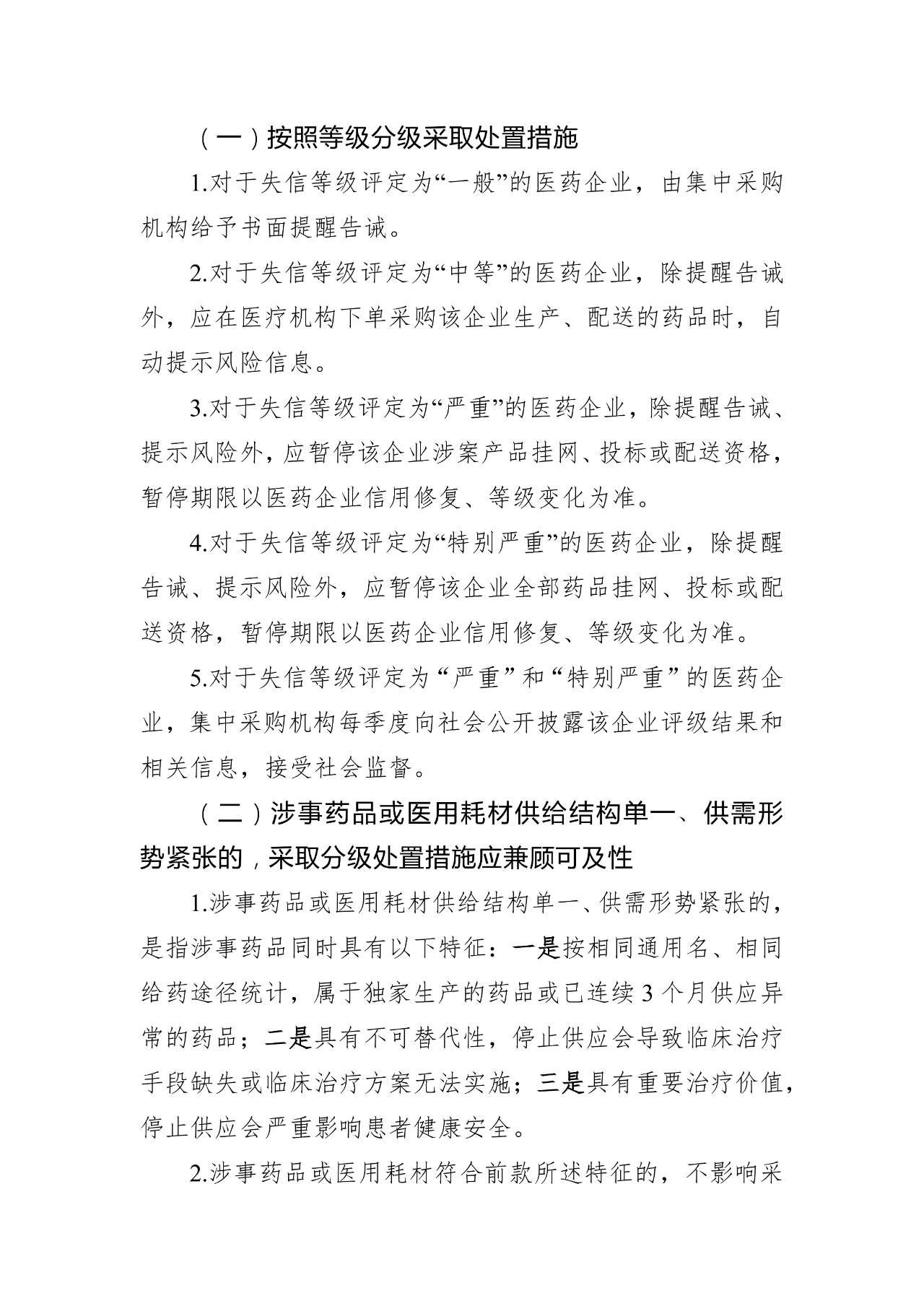 集中采购机构根据医药企业信用评级,将分别采取书面提醒告诫、向采购方提示风险信息、暂停该企业相关药品或医用耗材的投标挂网、暂停该企业配送中标药品或医用耗材资格、向社会公开披露失信信息等处置措施,压实医药企业失信违约责任。涉事药品或医用耗材供给结构单一、供需形势紧张的,采取分级处置措施时,应兼顾可及性,避免发生临床治疗手段缺失、严重影响患者救治的情况。