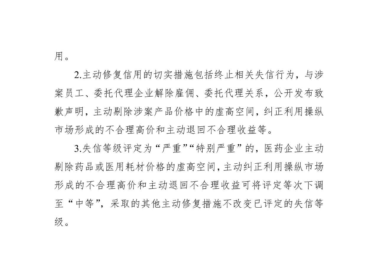 《指导意见》提出建立医药企业信用自动修复和主动修复的机制。失信行为超过一定时间的,不再追溯计入信用评价范围,实现自动修复。鼓励医药企业主动修复信用,在处置措施生效前提醒告知医药企业,并视情形给予一定的整改期,接受其在整改期内采取切实措施修复信用,包括终止相关失信行为,提交合规整改报告,公开发布致歉声明消除不良影响,剔除涉案药品或医用耗材价格中的虚高空间,退回不合理收益等。