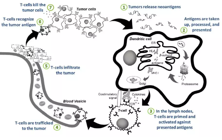 实际上,个体化癌症疫苗的开发是基于人体对癌症抗原的免疫反应。从肿瘤中释放的抗原会被像树突状细胞这样的抗原呈递细胞吞噬,经过处理后与主要组织相容性复合体相结合,呈现在细胞的表面。然后,这些呈现癌症抗原的细胞会迁移到淋巴结中,通过与T细胞表面的T细胞受体(TCR)结合,激活T细胞并促进它们的增殖。激活后的T细胞可以迁移到肿瘤附近,对肿瘤进行攻击。